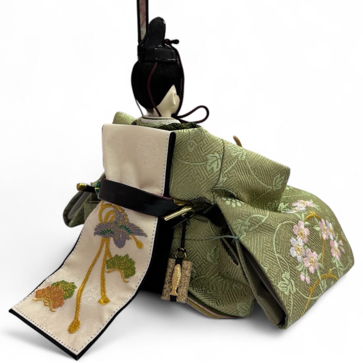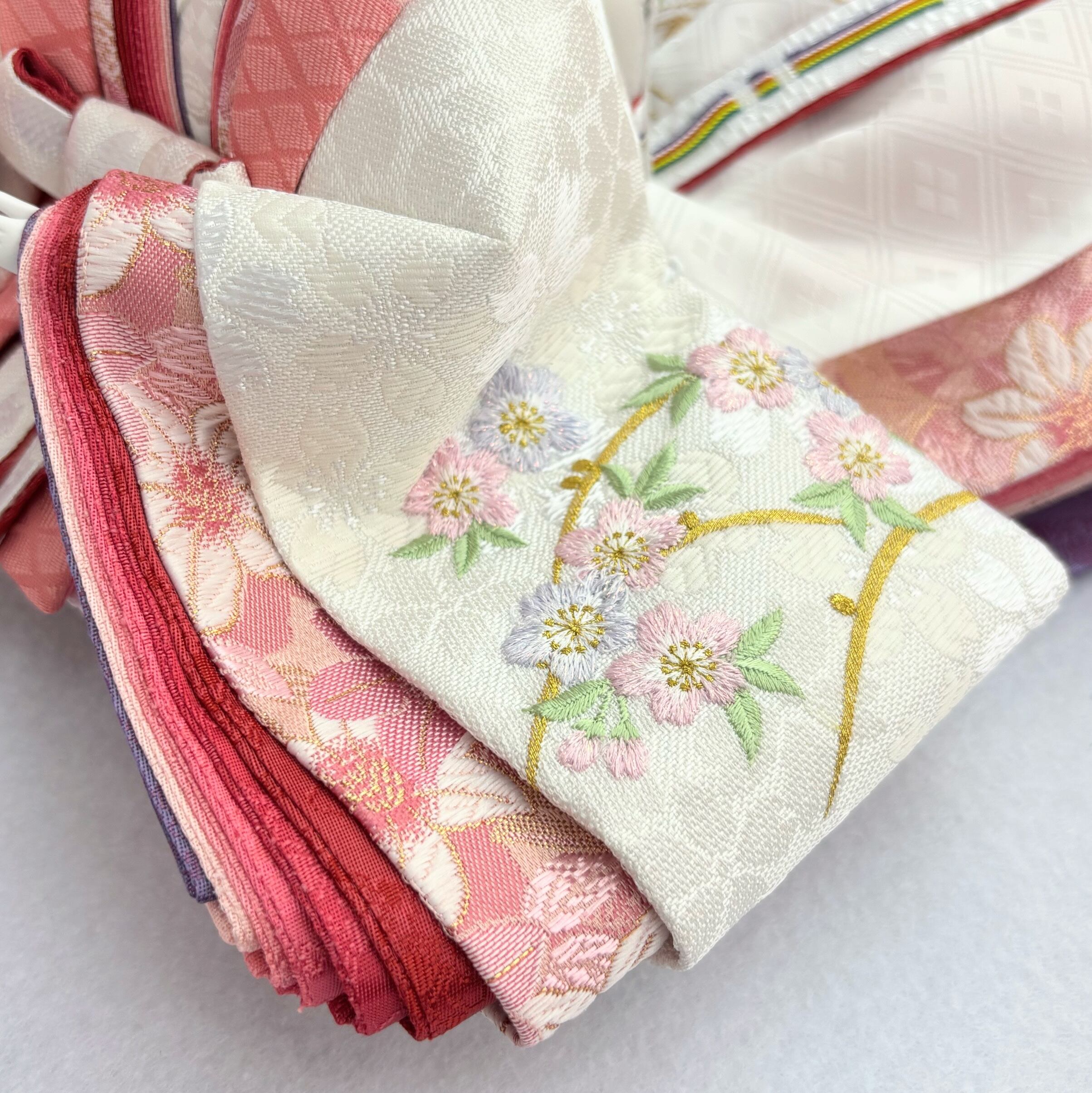 優しい色目に織り上げられた若草色と白×ピンクの衣装には枝桜刺繍が施されています。