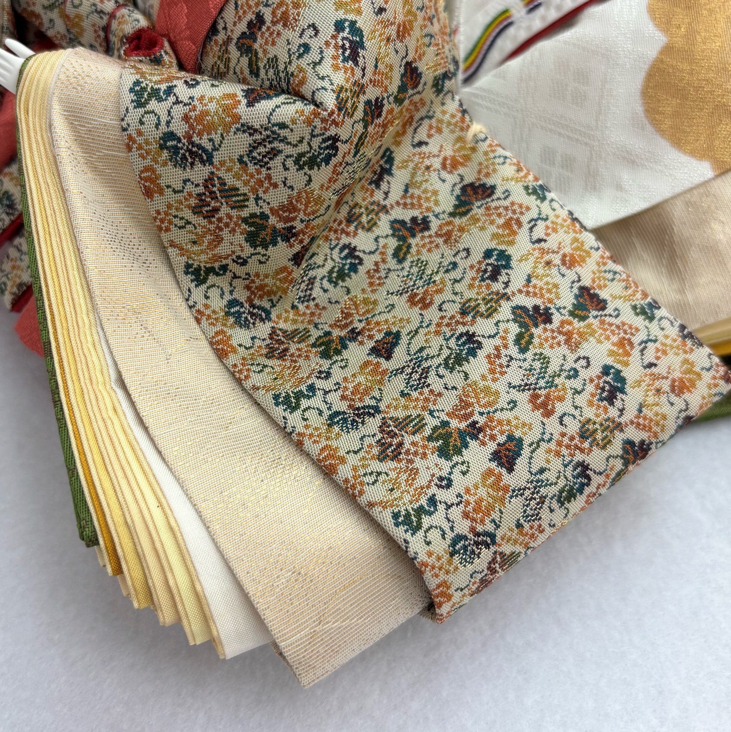 五衣のかさね色は「山吹の匂い」。春から夏にかけ黄金色の花を咲かせる山吹の花を表します。かさねの色目でいう「匂い」とは、現代でいう「グラデーション」を指し、濃から淡へ順々に重ねられます。