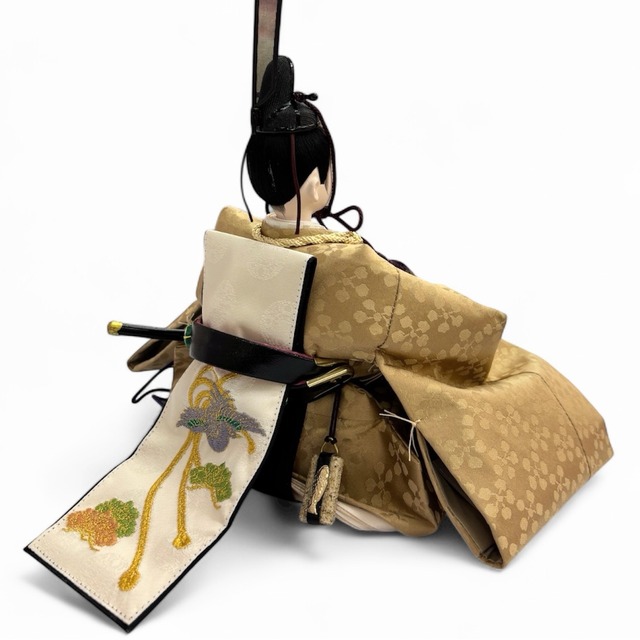 男雛には「利休緞子」、女雛には縁起の良い「葡萄唐草柄」のつづれ織りの帯を使用。