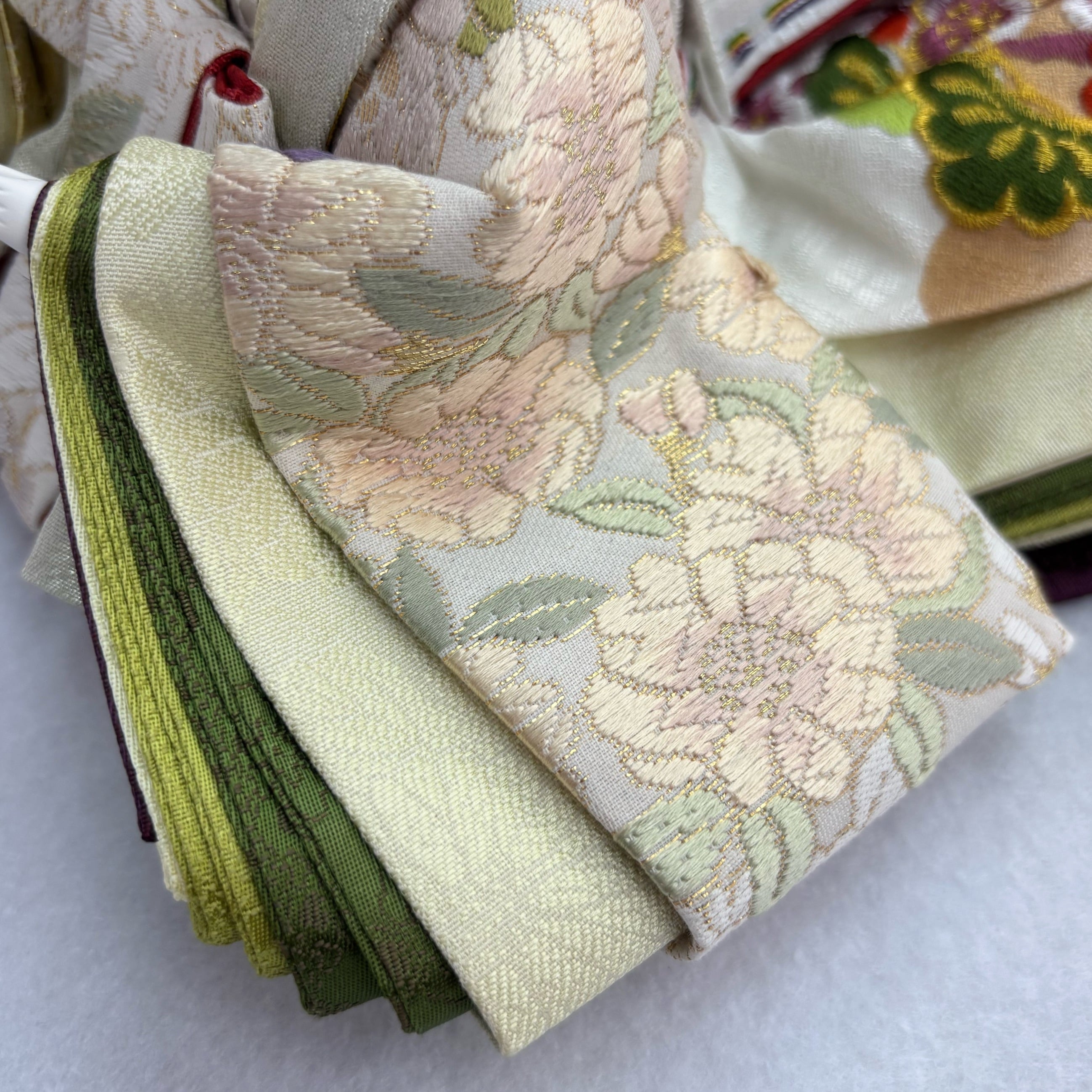 五衣のかさね色は「萌黄の匂い」。萌黄とは、萌え出た若葉のような冴えた黄味の緑色で若々しい印象を与えます。かさねの色目でいう「匂い」とは、現代でいう「グラデーション」を指し、濃から淡へ順々に重ねられます。