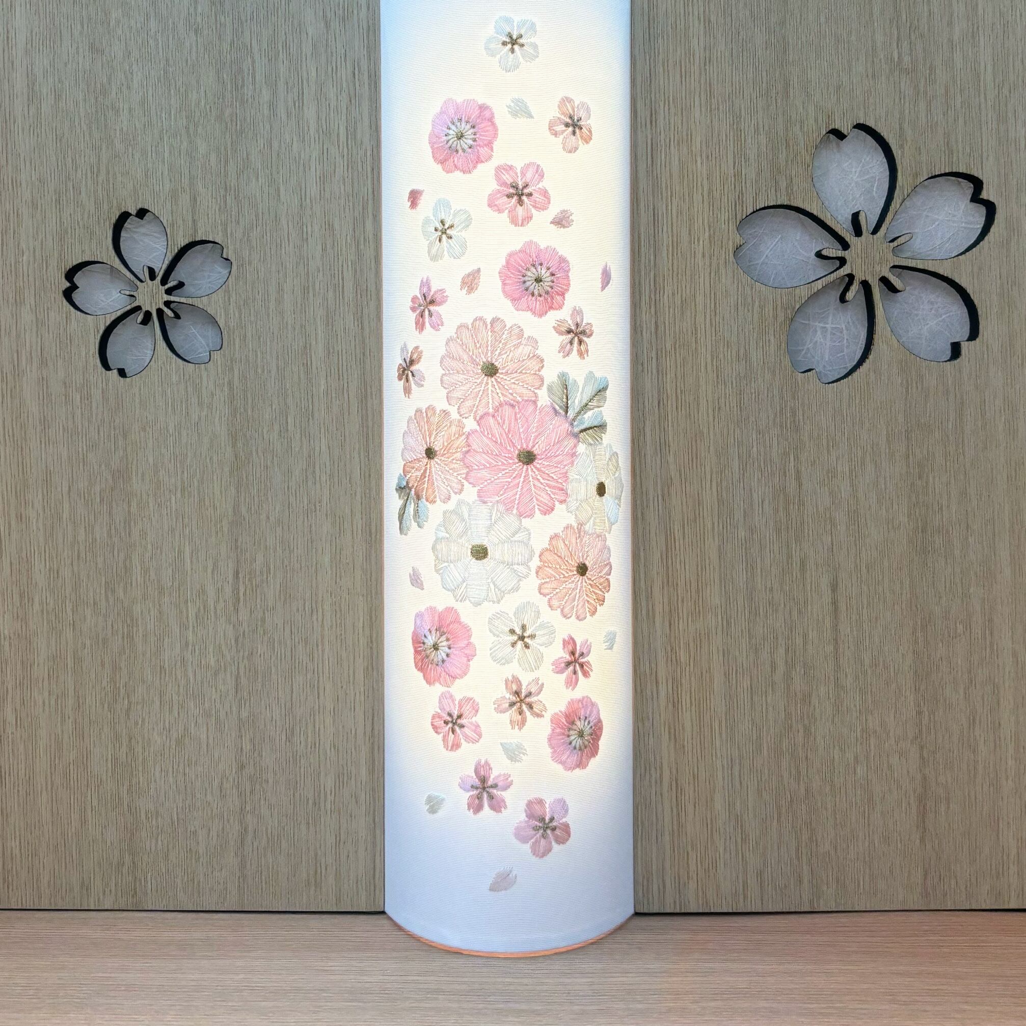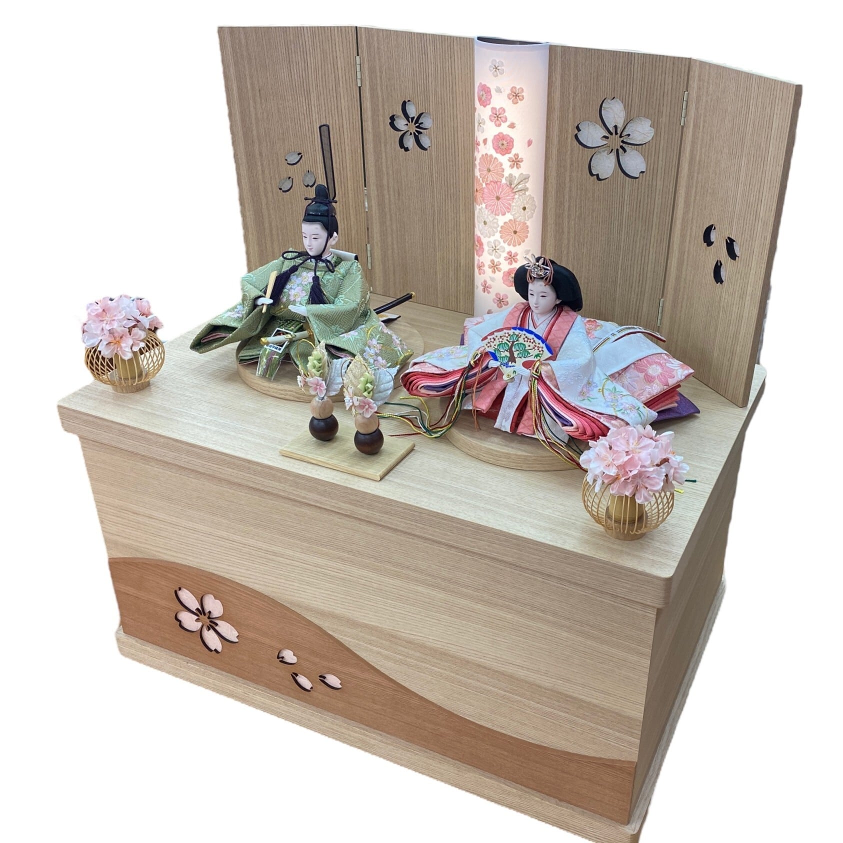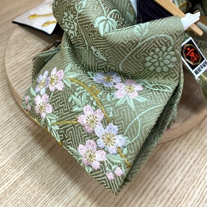 優しい色目に織り上げられた若草色と白×ピンクの衣装には枝桜刺繍が施されています。